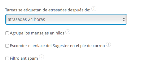 Para establecer el período después del cual los mensajes se muestran como "atrasadas", ve a Ajustes > Configuración del correo electrónico > Tareas se etiquetan de atrasadas después de y selecciona el tiempo deseado en el campo correspondiente.