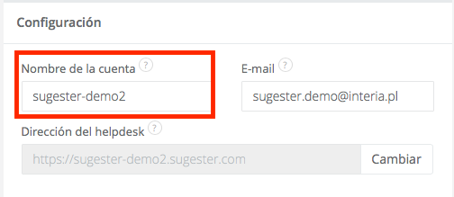 Para cambiar el nombre de tu cuenta del Sugester ve a Ajustes > Ajustes de cuenta > Configuración, y escribe el nombre que desees en el campo correspondiente.